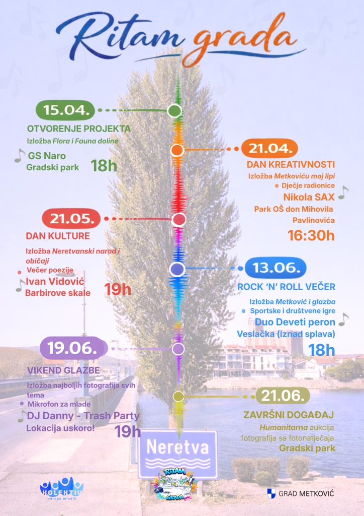 Metković od danas dobiva novi kulturno-zabavni puls. U organizaciji Udruge mladih Kolektiv, započinje prvi u nizu glazbeno-umjetničkih događaja u sklopu projekta “Ritam grada”, koji će tijekom travnja, svibnja i lipnja oživjeti više lokacija u gradu.
