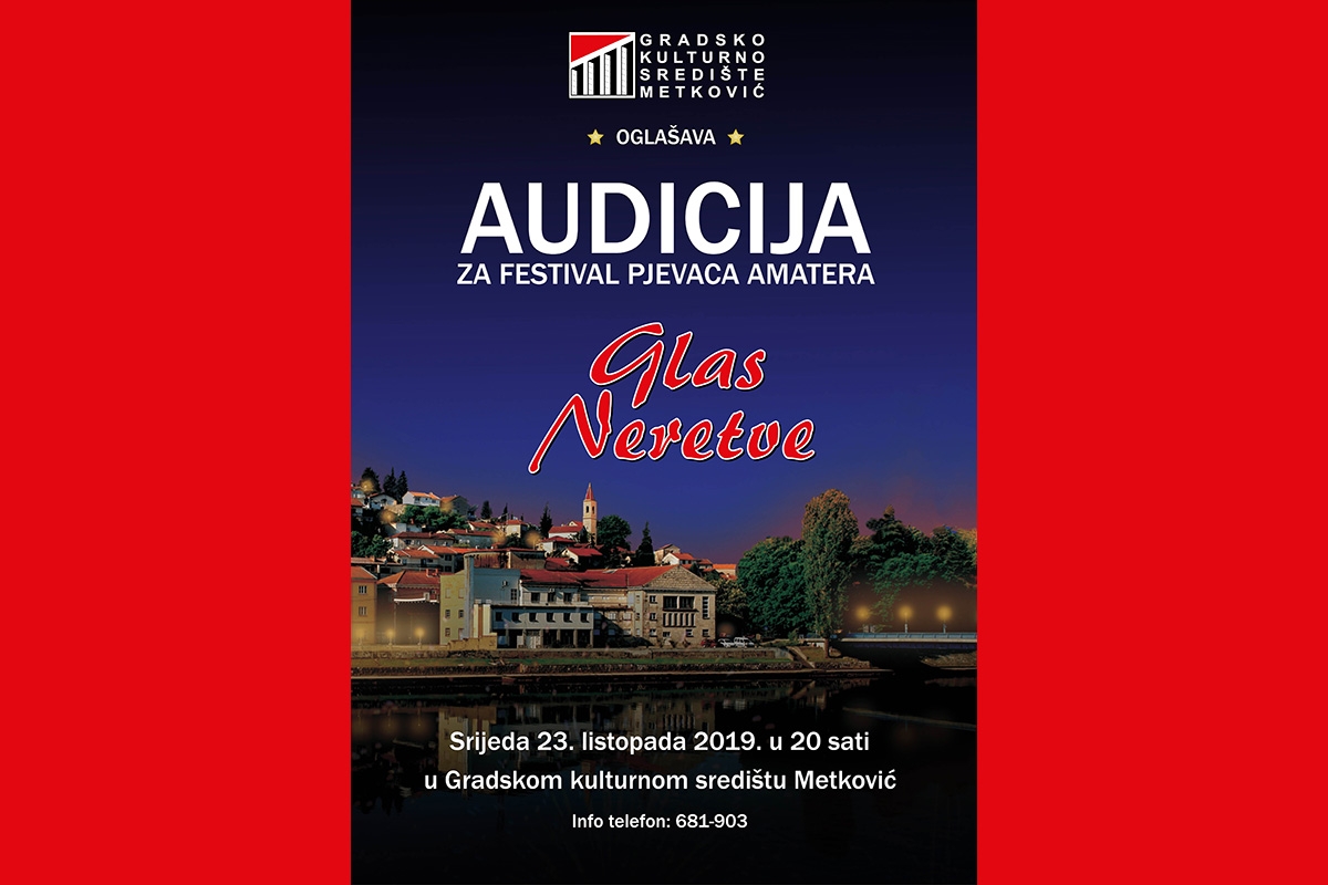 Svi zainteresirani pjevačice i pjevači pozivaju se na audiciju za tradicionalni metkovski festival amatera Glas Neretve. Audicija će se održat u GKS-u u srijedu 23. listopada s početkom u 20 sati.