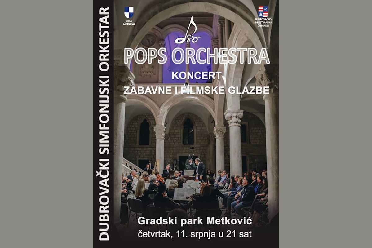 U organizaciji Ustanove za kulturu i sport Metković čast nam je pozvati Vas na koncert 11. srpnja u Gradskom parku u Metkoviću s početkom u 21 sat. DSO komorni orkestar “POPS” izvodit će filmsku, latino i pop – rock glazbu.