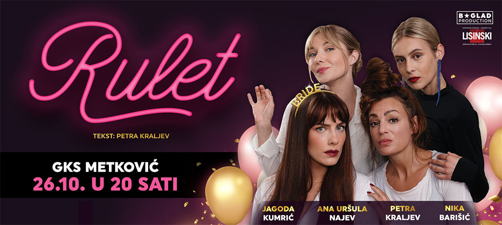 Uloge u predstavi tumače Jagoda Kumrić, Ana Uršula Najev, Petra Kraljev i Nika Barišić. Cijena ulaznice ja 12 eura, a mogu se kupiti u GKS-u svakim radnim danom u vremenu od 9 do 13 sati ili online – https://www.entrio.hr/event/rulet-komedija-20569