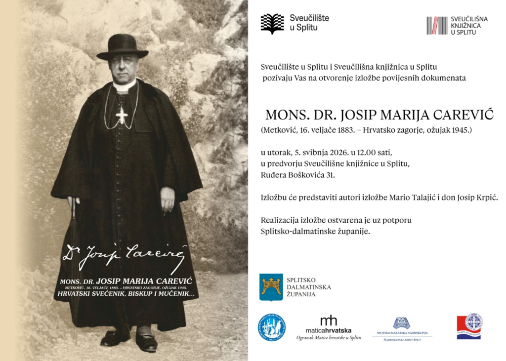 Sveučilište u Splitu i tamošnja Sveučilišna knjižnica organiziraju izložbu povijesnih dokumenata posvećenu ovom znamenitom hrvatskom svećeniku, biskupu i mučeniku. Otvorenje izložbe zakazano je za utorak, 5. svibnja 2026. godine, s početkom u 12:00 sati, u predvorju Sveučilišne knjižnice u Splitu (Ruđera Boškovića 31).