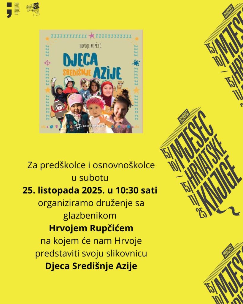 Dragadjeco, Gradska knjižnica Metković poziva vas na uzbudljivo putovanje u subotu 25. listopada 2025. godine u 10:30 sati kad će vamHrvoje Rupčić, hrvatski glazbenik, predstaviti svoju putopisnu slikovnicu Djeca Središnje Azije, a na predavanje su dobrodošli i veliki ljudi.