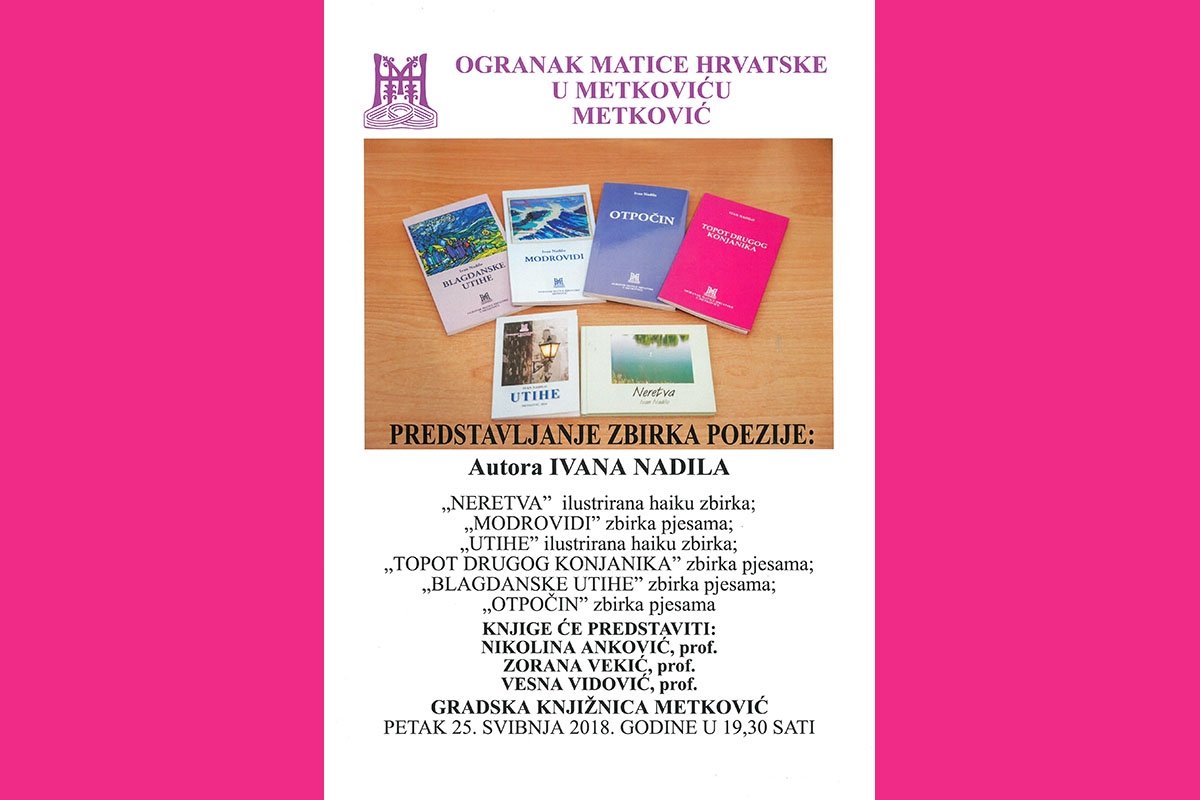 U petak 25. svibnja u Gradskoj knjižnici Metković, s početkom u 19,30 sati predstaviti će se zbirke poezije autora Ivana Nadila.