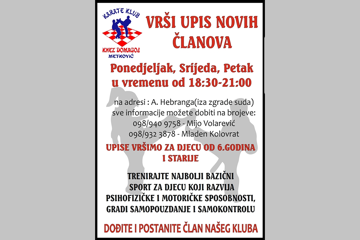 Povodom proširenja prostora treniranja karate klub Knez Domagoj u mogućnosti je primiti još novih članova, s toga pozivamo svu djecu da nam se pridruže i postanu članom našeg kluba.