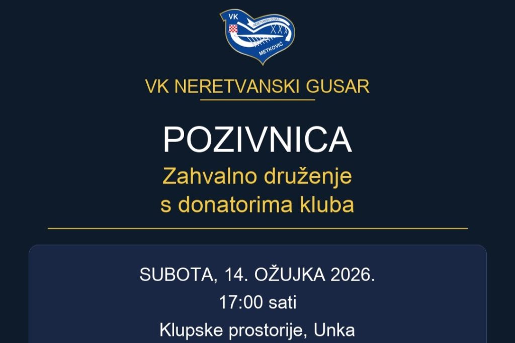 S radošću vas pozivamo na zahvalno druženje u subotu, 14. ožujka 2026. u 17:00 sati u klupskim prostorijama na Unki u Metkoviću.