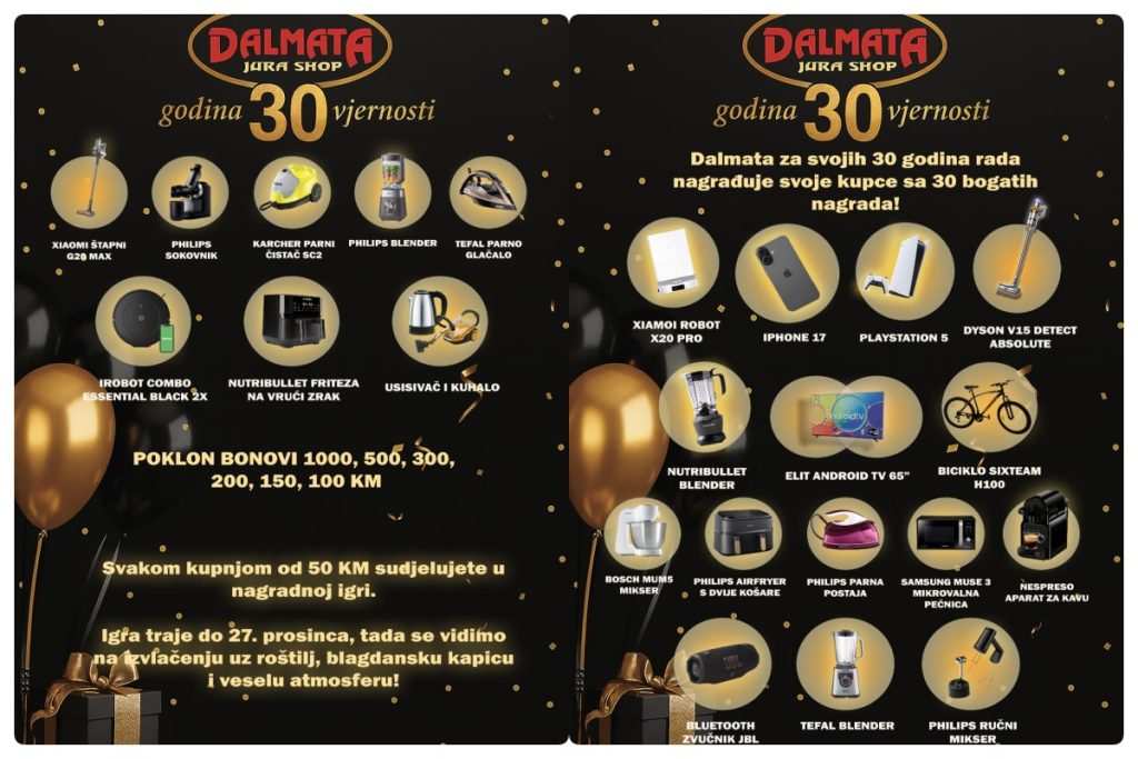 U znak zahvalnosti za tri desetljeća povjerenja, Dalmata Jure Shop nagrađuje svoje kupce s čak 30 iznimno vrijednih nagrada, čime blagdanska kupovina postaje još uzbudljivija.