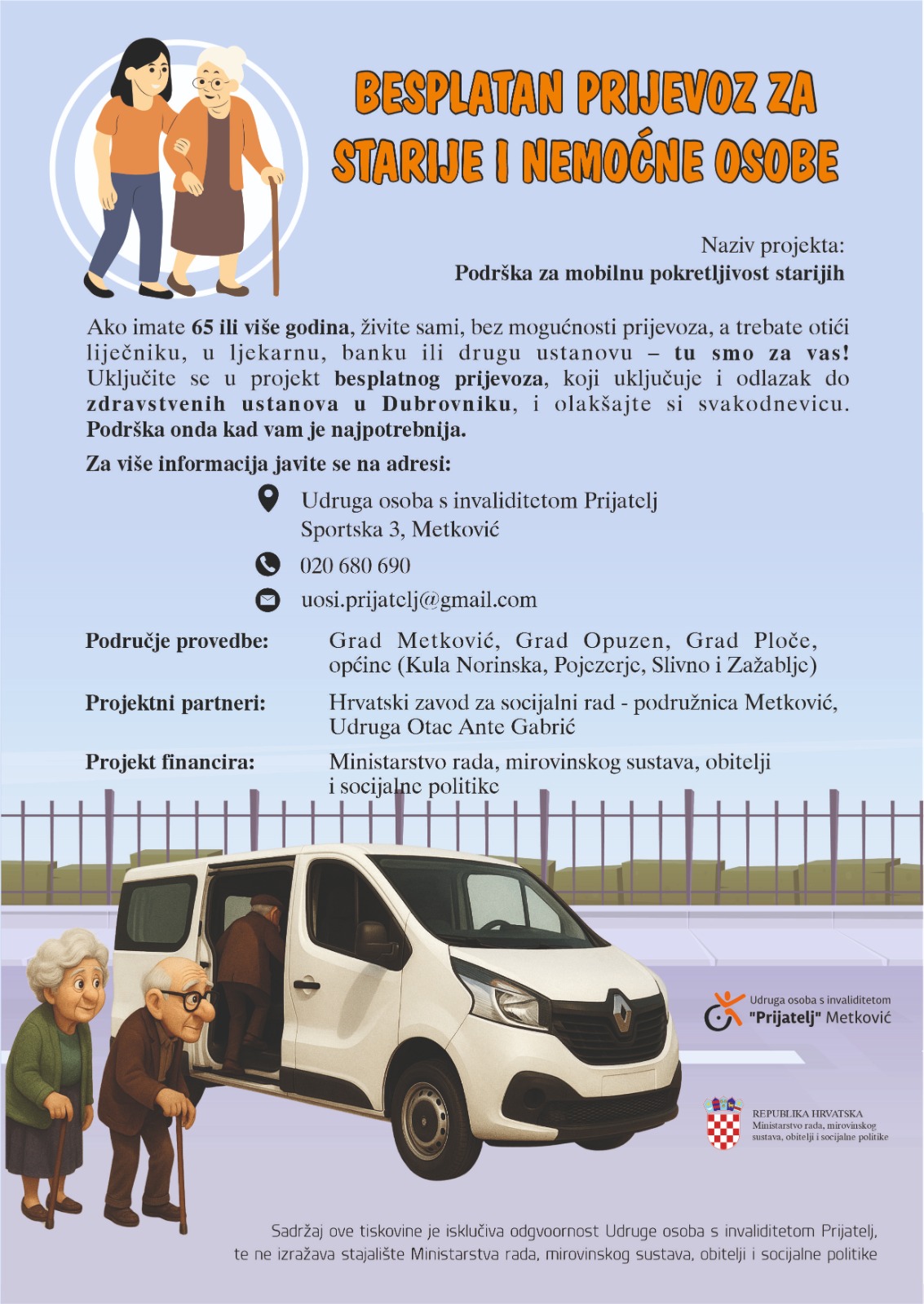 Udruga osoba s invaliditetom Prijatelj Metković pokrenula je novi program „Podrška za mobilnu pokretljivost starijih“, koji omogućuje besplatan prijevoz za osobe starije od 65 godina. Ova inicijativa, financirana od strane Ministarstva rada, mirovinskog sustava, obitelji i socijalne politike za 2025. i 2026. godinu, ima za cilj olakšati život starijim građanima koji nemaju pristup javnom prijevozu ili podršku obitelji.