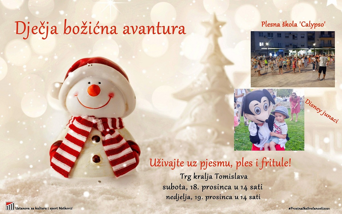 Riječ je o zabavno-plesnom programu za djecu, tijekom kojih će ih animirati Disney likovi te Plesna škola Calypso, a spremne će biti i omiljene božićne slastice – fritule! ‘Dječja božićna avantura’ održat će se u subotu, 18. prosinca te u nedjelju, 19. prosinca. Početak je u 14 sati, a planirani završetak oko 16 sati.