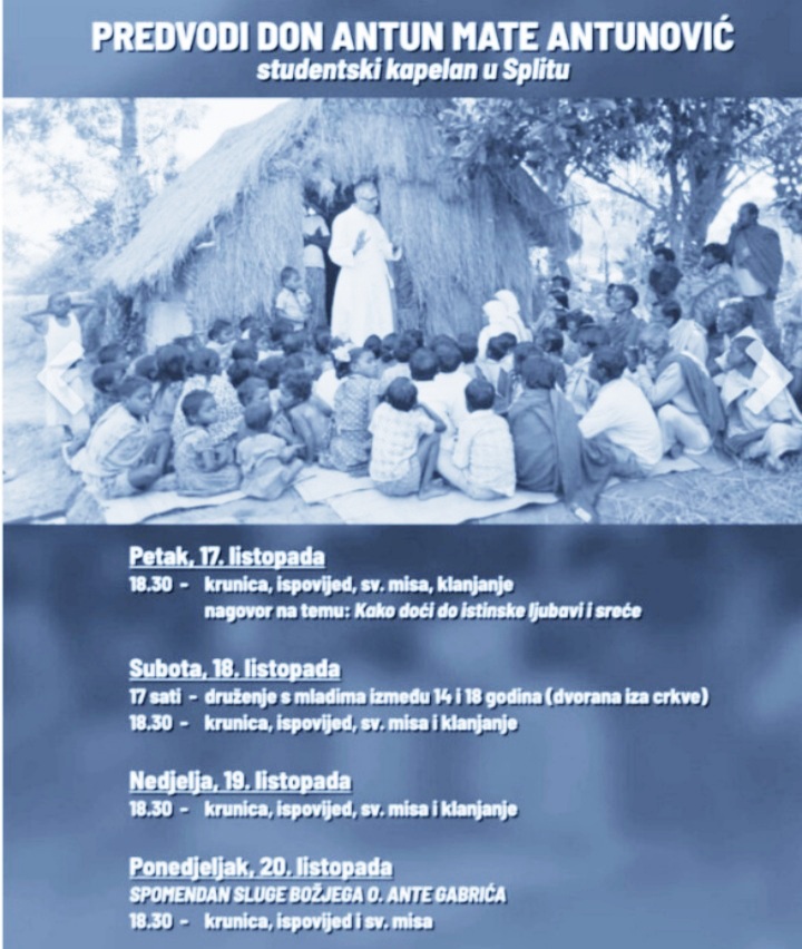 Duhovna obnova u spomen na slugu Božjega o. Antu Gabrića održat će se u njegovoj rodnoj Župi sv. Ilije u Metkoviću od petka 17. listopada do ponedjeljka 20. listopada, koju će predvoditi studentski kapelan u Splitu don Antun Mate Antunović.