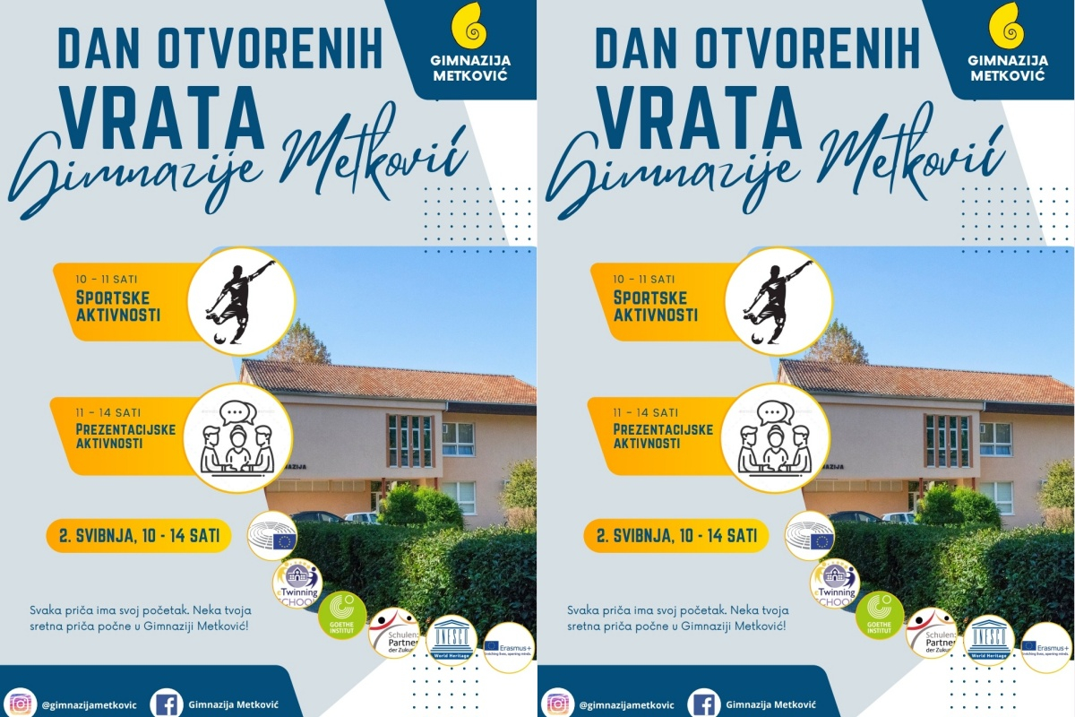 Dan otvorenih vrata Gimnazije Metković održat će se u četvrtak, 2. svibnja 2024., za buduće učenike Gimnazije, osmaše i njihove roditelje, ali i sve posjetitelje iz Metkovića i okolnih mjesta.