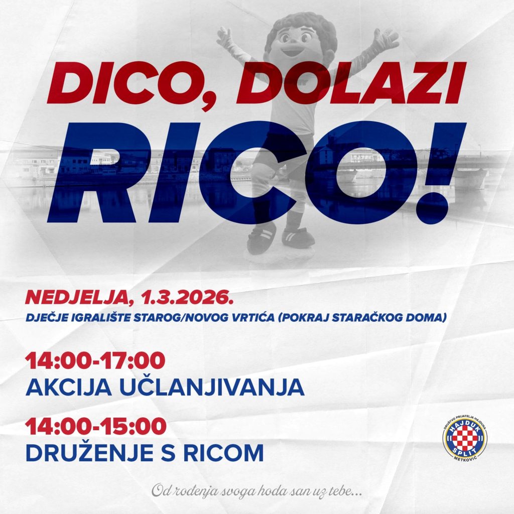 U organizaciji Društva prijatelja Hajduka (DPH) Metković, ove nedjelje sprema se pravi mali spektakl za najmlađe navijače splitskog kluba, ali i njihove roditelje. U goste stiže Rico, službena i svima omiljena maskota HNK Hajduk Split, koji će donijeti pravi navijački duh na jug Hrvatske.
