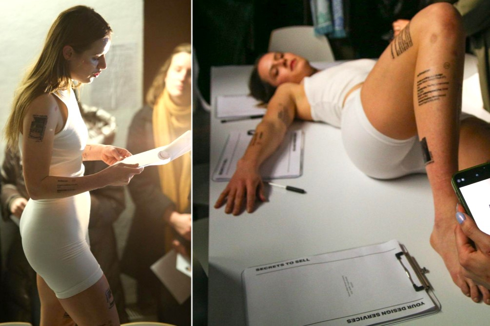 Slično izokretanje rakursa posrijedi je i u posljednjem, najrecentnijem radu Secrets to sell your Design Services koji je osmišljen i premijerno izveden 2022. u istom kontekstu koji sam adresira, na dizajnerskom sajmu svih dizajnerskih sajmova – Milanskom tjednu dizajna. Teza od koje autorica ovoga puta polazi jest da dizajneri na ovakvim manifestacijama prije svega prodaju sebe, a tek potom predmete koje dizajniraju. Secrets to sell your Design Services je participativni performans, što znači da uključuje sudjelovanje publike, a odvija se na i uokolo konferencijskog stola na kakvima se održavaju, primjerice, korporativni sastanci. Publika je ovdje u ulozi potencijalnog klijenta, investitora ili poslodavca i sjedi na stolicama, dok se performerice (izvorno duo Xenofemme, koji osim Borovac uključuje i talijansku interdisciplinarnu dizajnericu Ginevru Petrozzi) u sterilno-bijelim kostimimima kreću, puze, hodaju i izležavaju na samom stolu i publici čitaju odlomke iz ugovora koji definira uvjete eventualne buduće poslovne suradnje, a tijela su im oblijepljena tetovažama koje sadrže CV i profesionalne portfolije obiju dizajnerica. Prizor je nadrealan i automatski nelagodan, dizajnerice u ovako koreografiranim ulogama nalikuju zvijerima u kavezima, što reflektira njihovu ranije spomenutu poziciju na masovnim strukovnim sajmovima, no u ovoj transakciji međusobnih pogleda upravo su posjetitelji ti koji su izloženi – ova predstava o odnosima moći u kreativnoj industriji, u kojem se scenski prostor prelijeva s pozornice u gledalište, prijeti da proguta svoje gledatelje.