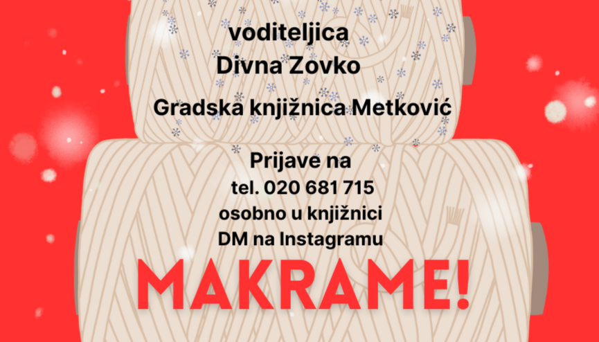 Gradska knjižnica Metković poziva sve male kreativce na zanimljivu i edukativnu radionicu pod nazivom „Makrame za djecu“. Ovo kreativno druženje održat će se u ponedjeljak, 24. studenoga 2025. godine s početkom u 18 sati.