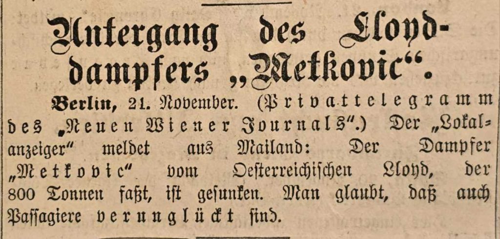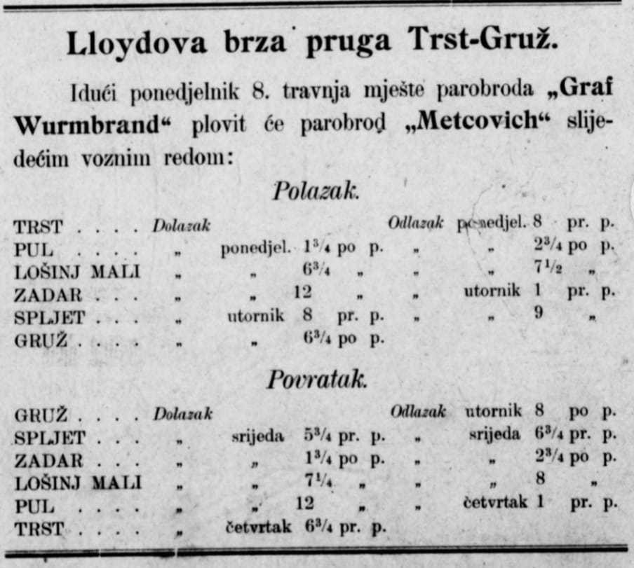 Bio je ponos najveće brodarske kompanije Monarhije i cijelog Jadrana, pozornica u Trstu prilikom ispraćaja posmrtnih ostataka Sofije i Franza Ferdinanda, imao je specijalnu misiju u Prvome svjetskom ratu, a njegovo ime izazivalo je žestoke proteste. Parobrod Metcovich imao je burnu povijest i sudjelovao je u mnogim događajima s kraja19. i početka 20. stoljeća.