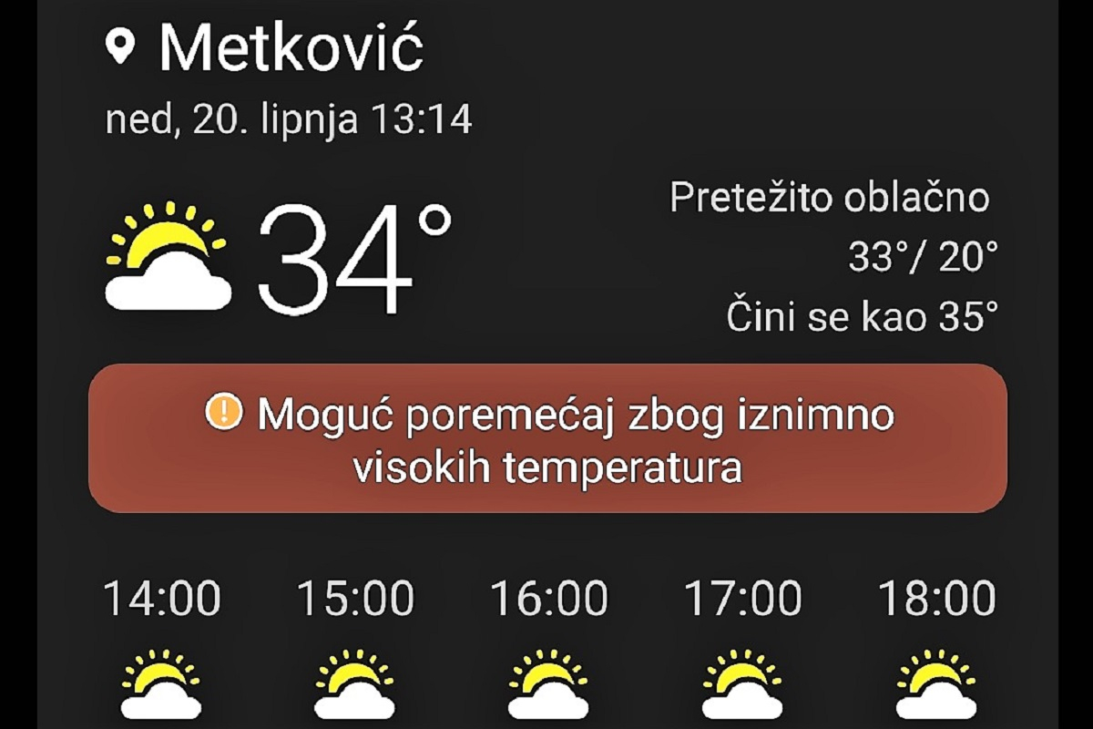 U Metkoviću u 13 sati bilo je 34° C. Tijekom poslijepodneva temperatura će se podići do 36°.