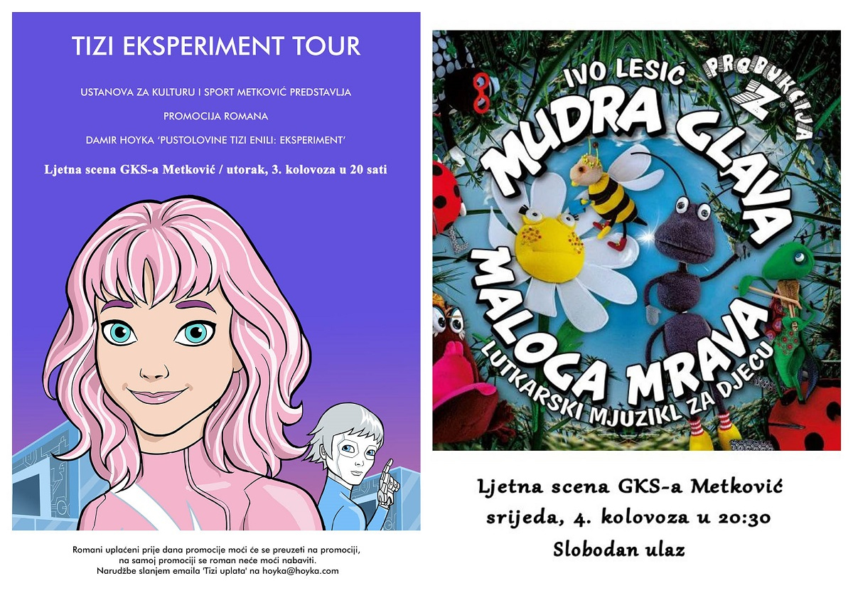 U utorak, 3. kolovoza na Ljetnoj sceni GKS-a Metković s početkom u 20 sati na rasporedu je promocija romana za djecu i mlade „Pustolovine Tizi Enili: Eksperiment“ autora Damira Hoyke, našega nagrađivanoga fotografa.