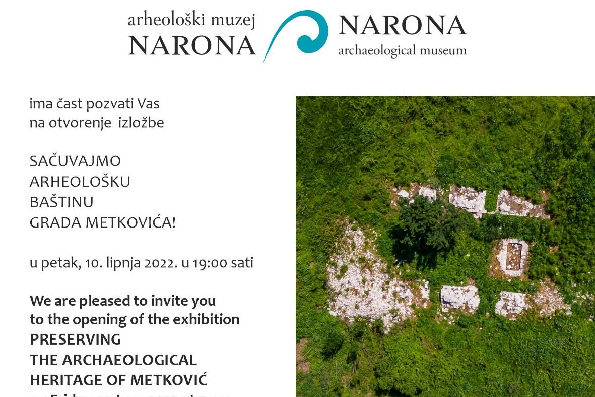 U Arheološkom muzeju Narona se u petak, 10. lipnja 2022. g. u 19:00 sati otvara izložba Sačuvajmo arheološku baštinu grada Metkovića! organizirana povodom obilježavanja 600 godina od prvog spomena Metkovića u povijesnim izvorima. Cilj izložbe je educiranje posjetitelja svih uzrasta o važnosti očuvanja i istraživanja arheološke baštine. Pri obilascima nalazišta tijekom ove godine uočili smo brojne devastacije nastale djelovanjem prirode i čovjeka. Trenutno stanje dijela arheološke baštine na prostoru grada Metkovića na izložbi je prezentirano putem fotografija 14 lokaliteta. Autorica izložbe je viša kustosica Konstanta Bukovac, a autor fotografija je fotograf Marin Veraja.