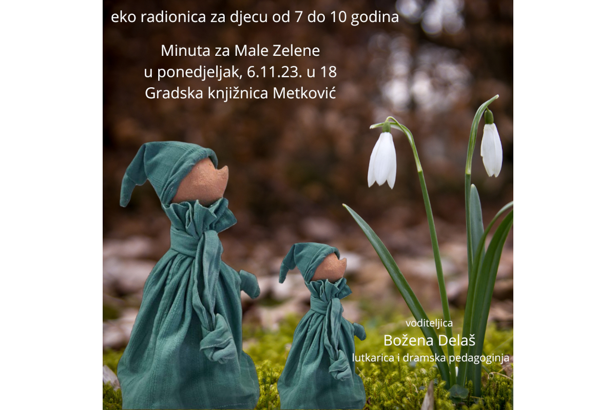 “Minuta za male zelene” – eko radionica za djecu od 7 do 10 godina, u ponedjeljak, 6. studenoga 2023. u 18 sati u Gradskoj knjižnici Metković. Voditeljica, lutkarica i dramska pedagoginja Božena Delaš