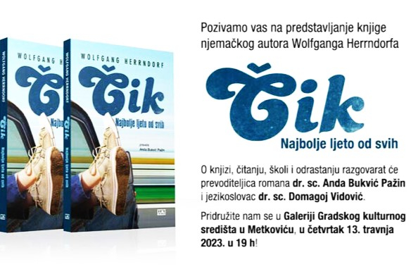 To je priča nedavno objavljenog romana njemačkog ilustratora i pisca Wolfganga Herrndorfa ‘Čik. Najbolje ljeto od svih’, koji će predstaviti prevoditeljica romana dr. sc. Anda Bukvić Pažin, u razgovoru sa svojim školskim kolegom (iz osnovne i srednje u Metkoviću, ne u Berlinu), jezikoslovcem dr. sc. Domagojem Vidovićem.