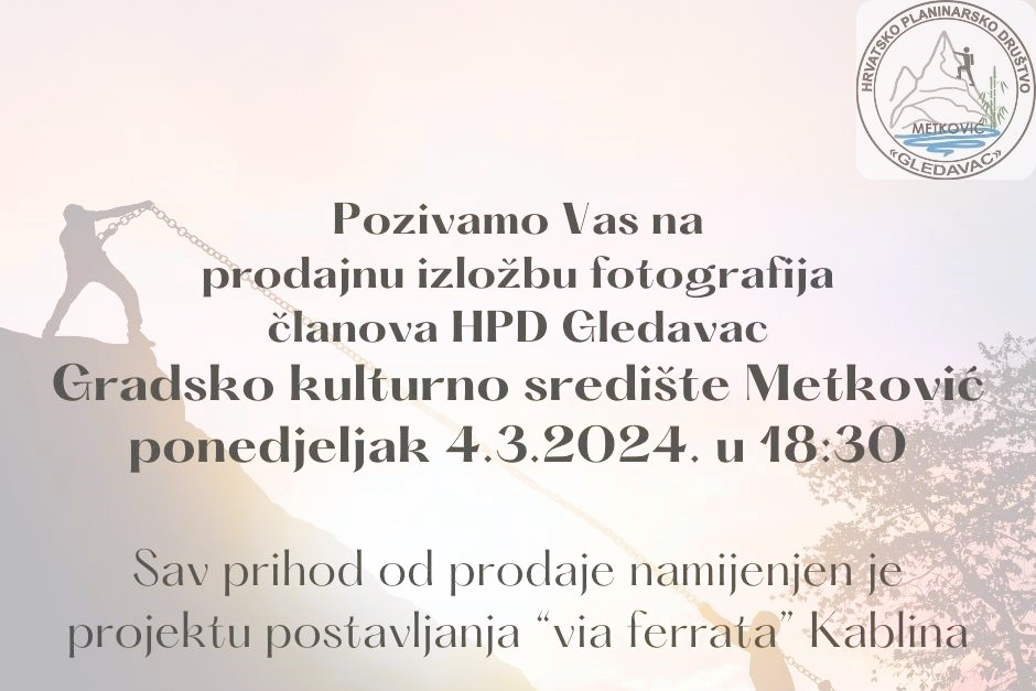 Najljepše fotografije s izleta HPD Gledavca u 2023. godini prošle su foto natječaj, tiskane i spremne da uljepšaju Vaše prostore. Sav prihod ostvaren prodajom ide u fond za ostvarenje projekta “via ferrata” na Kablini (Mala Rujnica). Ovim projektom dolina Neretve dobila bi jednu zanimljivu adrenalinsku točku, a istovremeno bi to mjesto bilo izvanredno za vježbu prije planinarskih uspona na kojima se nalaze “via ferrate”. Za sve one koji žele nešto više pročitati o “via ferrata” prilažemo link: https://www.hikingcro.com/blog/viaferrata Početna cijena fotografija je 10€, a pravo prvootkupa imaju autori fotografija. Dođite, pogledajte i uživajte s nama šetnjom planinskim vrhovima.