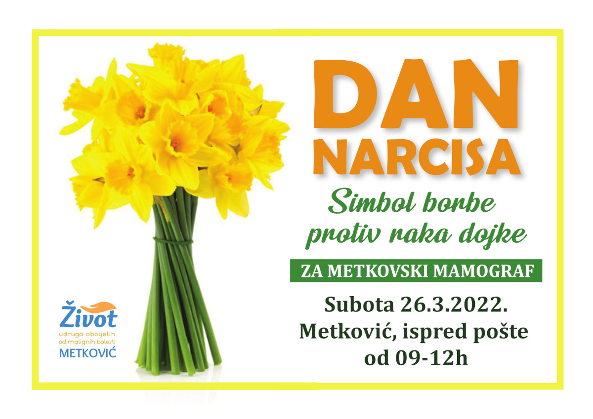 Već tredicionalno, prve subote u proljeće obilježavamo Dan narcisa, Dan borbe protiv karcinoma dojke. Podjelom promidžbenog materijala HZZJZ i sadnica Narcisa krećemo u aktivnosti prikupljanja dobrovoljnih priloga i donacija za kupnju metkovskog mamografa.