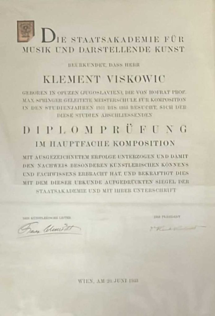 Nakon odlaska iz Metkovića Klement je upisao Višu muzičku školu u Ljubljani, a poslije toga nastavio je školovanje u Beču, na Muzičkoj akademiji. Zbog bolesti je morao prekidati studiranje i tada mu je novčana pomoć stizala iz Metkovića, od tamošnjih glazbara koje je kratko vrijeme vodio. Dok je bio na liječenju u jednoj bečkoj bolnici, Glazba je željela financijski pomoći njegovo liječenje. Zbog toga je priredila koncert s pozivnicama, a sav prihod s koncerta iskorišten je za njegovo liječenje. Diplomirao je na Višoj muzičkoj akademiji u Beču 1936., gdje je i radio do 1972. godine.