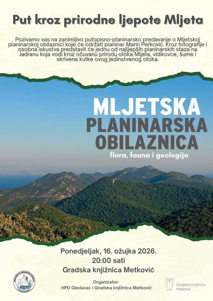 Za sve ljubitelje prirode, planinarenja i putovanja, Gradska knjižnica Metković u suradnji s Hrvatskim planinarskim društvom (HPD) “Gledavac” priprema pravu poslasticu. U ponedjeljak, 16. ožujka s početkom u 20 sati, održat će se zanimljivo putopisno-planinarsko predavanje pod nazivom „Mljetska planinarska obilaznica – flora, fauna i geologija“.