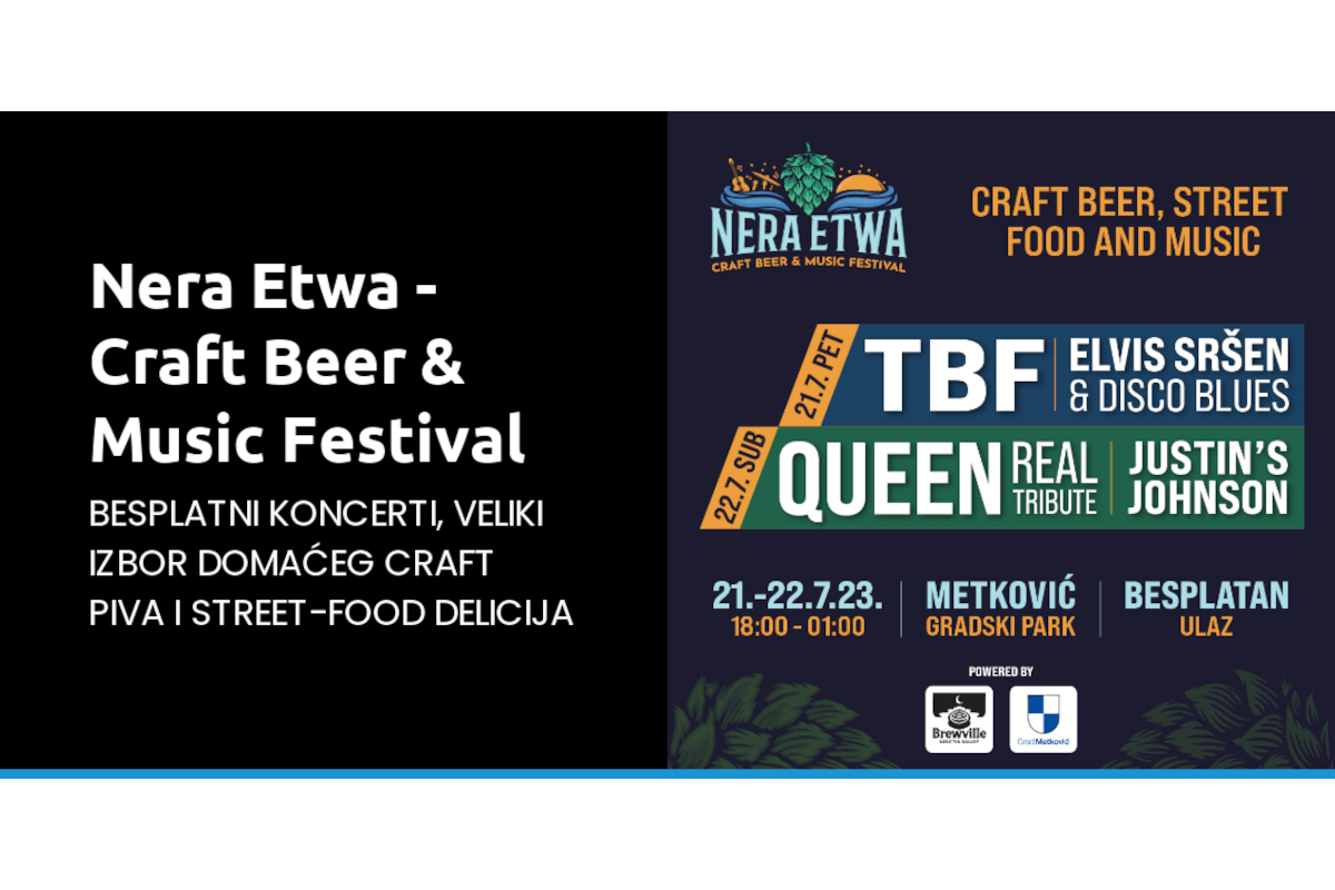 Prvi Nera Etwa – Craft Beer & Music Festival u velikom stilu spojit će glazbu, craft pivo i street food 21. i 22. srpnja u prekrasnom zelenom okruženju Gradskog parka u Metkoviću! Nera Etwa svakog dana od 18 do 1 sat iza ponoći donosi jako atraktivan program kojeg čine: besplatni koncerti vrhunskih bendova, više od petnaest vrsta kvalitetnog craft piva ponajboljih pivovara iz doline Neretve i okolice te bogata ponuda street-food specijaliteta.