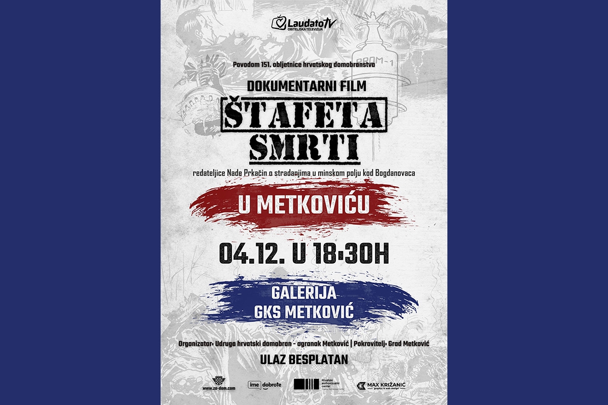 Pozivate se na projekciju dokumentarnog filma redateljice Nase Prkačin, ‘Štafeta smrti‘ o stradanjima u minskim poljima kod Bogdanovaca. Film će biti prikazan u srijedu 4. prosinca u galeriji GKS-a Metković s početkom u 18.30 sati. Organizator projekcije filma je Udruga hrvatski domobran-ogranak Metković pod pokroviteljstvom Grada Metkovića.