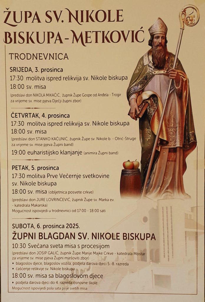 Župa sv. Nikole biskupa u Metkoviću, u kojoj se od 2019. god., nalazi relikvijar sveca prvog stupnja, proslavit će u subotu 6. prosinca blagdan zaštitnika.