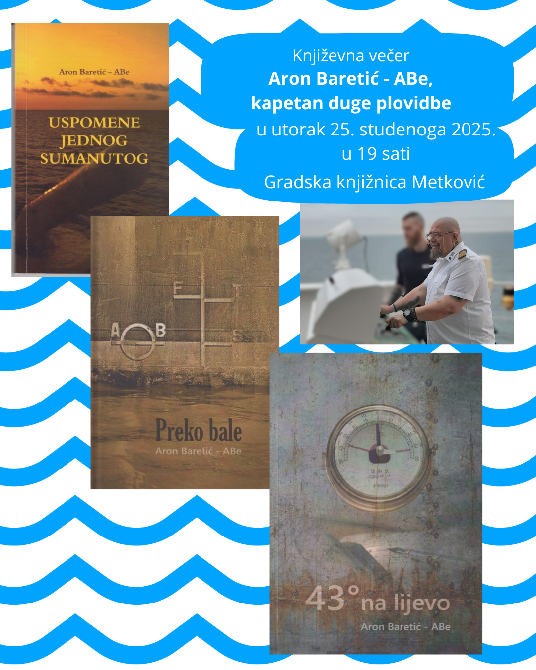 Gradska knjižnica Metković sa zadovoljstvom najavljuje književnu večer s osebujnim gostom – pjesnikom, prozaistom i kapetanom duge plovidbe, Aronom Baretićem – AB-eom.