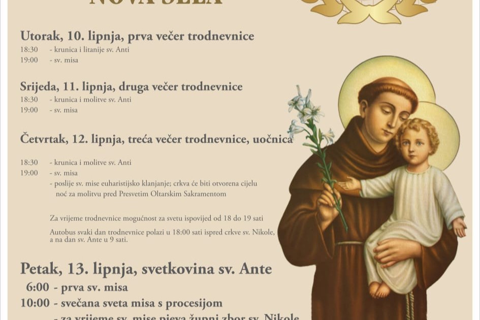 Četvrtak, 12. lipnja – Treća večer trodnevnice, uočnica - 18:30 – Krunica i molitve sv. Anta