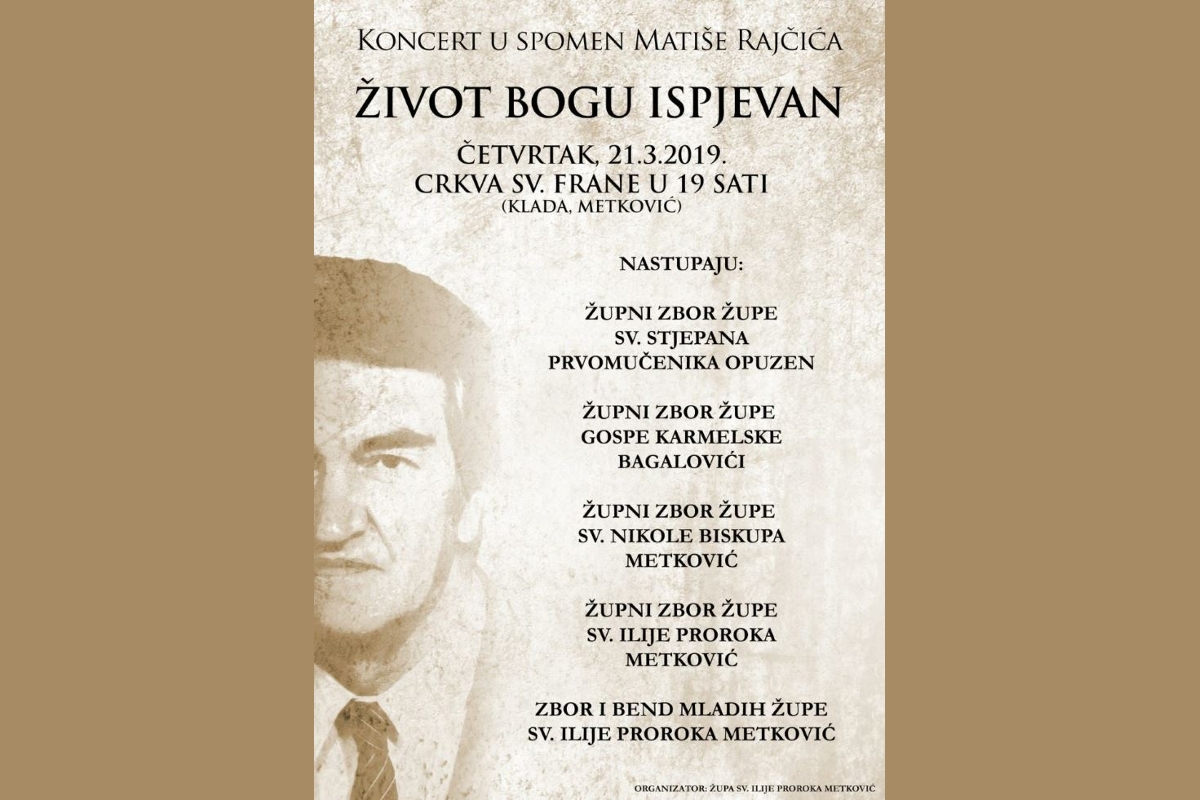 Župa sv. Ilije proroka Metković i ove godine organizira koncert u spomen na iznimnog čovjeka i glazbenika Matišu Rajčića (Metković, 1940. – Zagreb,1996.) pod nazivom ‘Život Bogu ispjevan’.