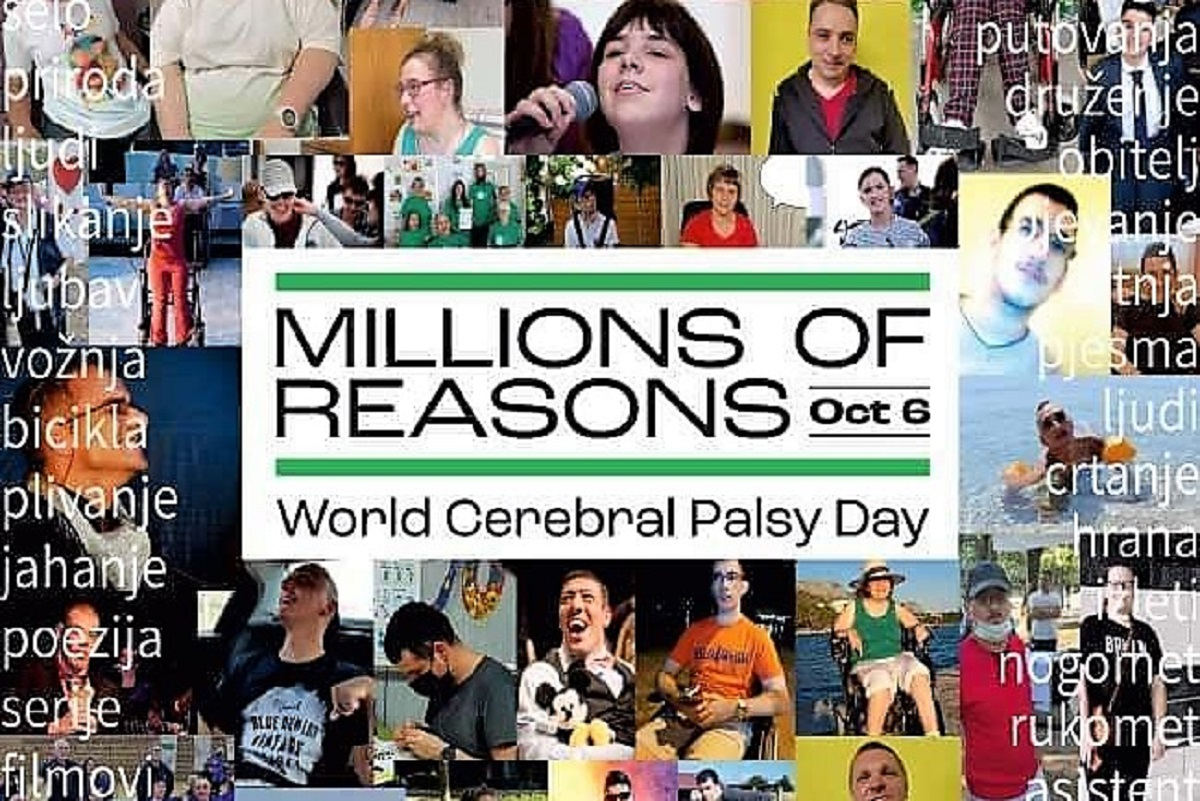 Naša Udruga se pridružuje organizacijama diljem svijeta u obilježavanju Svjetskog dana cerebralne paralize. Svjetski dan CP nas podsjeća na to da 17 milijuna ljudi širom svijeta živi s cerebralnom paralizom. Kao što slogan kampanje kaže – postoje “milijuni razloga” za proslavu Svjetskog dana CP i prepoznavanje postignuća ljudi s CP, obitelji i profesionalaca koji ih podržavaju.
