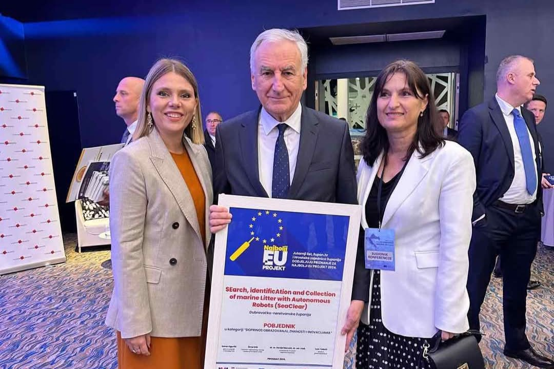 Na ovogodišnji natječaj, koji je bio otvoren tijekom lipnja i srpnja, pristigli su projekti iz svih hrvatskih županija, od kojih je njih 61 zadovoljilo propisane kriterije i ušlo u finalni izbor. Regionalna agencija DUNEA kandidirala je između ostalih i projekt SeaClear – Pretraživanje, identifikacija i prikupljanje otpada u moru s autonomnim robotima. Upravo je projekt SeaClear jedan od najistaknutijih pobjednika, osvojivši prvo mjesto u kategoriji “Doprinos obrazovanju, znanosti i inovacijama”! Čast da preuzme nagradu na svečanosti proglašenja pripala je županu Dubrovačko-neretvanske županije županije Nikoli Dobroslaviću. Na svečanoj dodjeli sudjelovala je i ravnateljica Regionalne agencije DUNEA Melanija Milić.