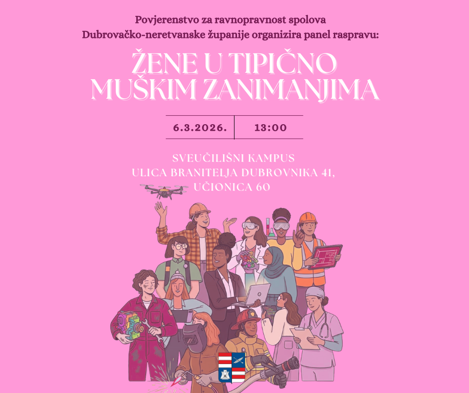 Povodom Međunarodnog dana žena, Povjerenstvo za ravnopravnost spolova Dubrovačko-neretvanske županije organizira panel raspravu „Žene u tipično muškim zanimanjima“ koja će se održati u petak, 6. ožujka 2026., s početkom u 13:00 sati, u Sveučilišnom campusu, Ulica branitelja Dubrovnika 41, učionica 60. U  raspravi o svakodnevnim izazovima obavljanja aktivnosti muškog zanimanja, govorit će vozačica Libertasova autobusa Tereza Brajović, inženjerka građevine Danijela Begić i doktorica znanosti iz područja robotike i automatizacije Ivana Palunko.